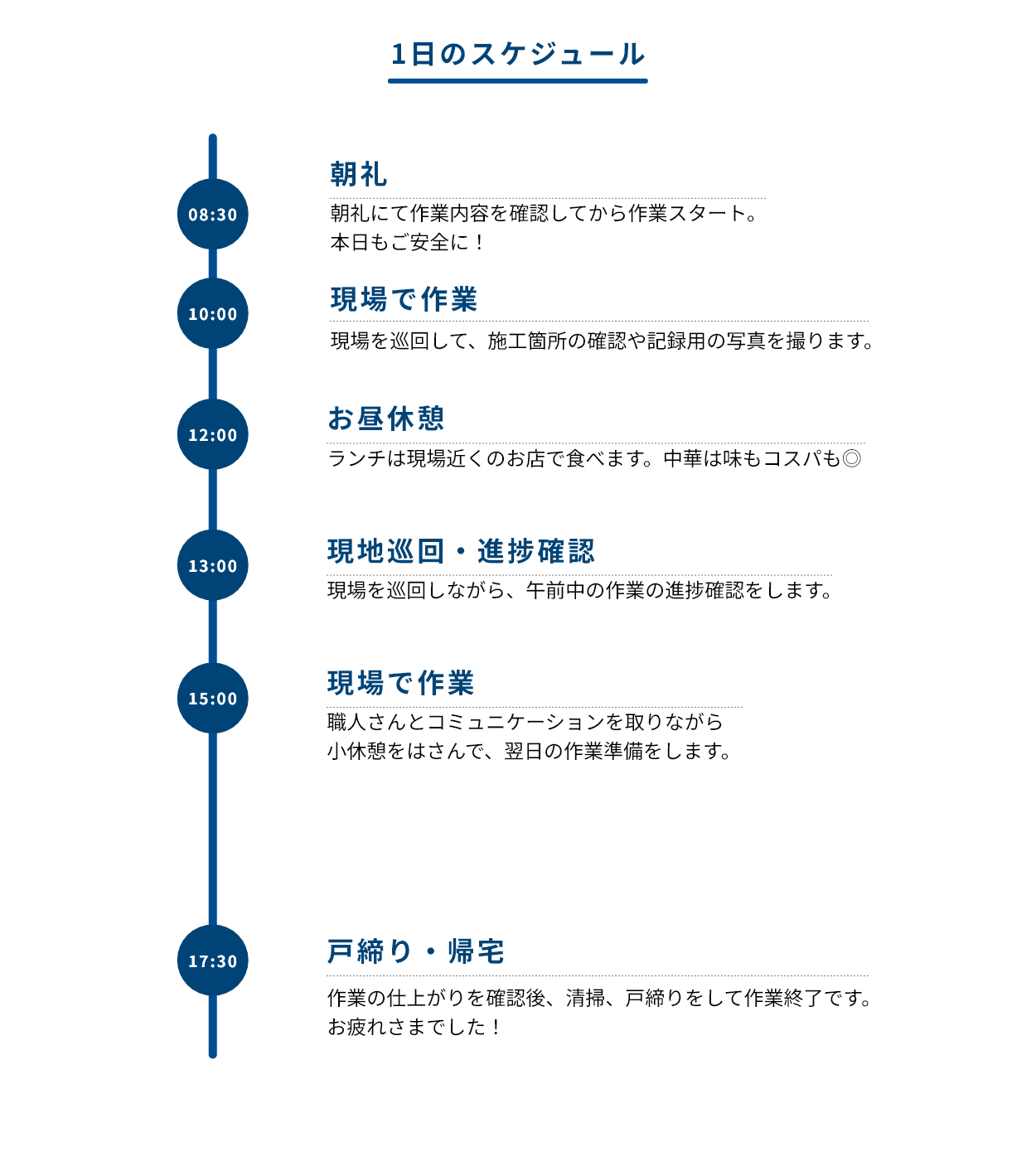 施工管理(現場監督)として主にビルの改修工事を担当しています。工事が計画通りに進んでいるかのチェック、品質の確認や現場の安全管理等、勤務時間の大半を現場で過ごしています。